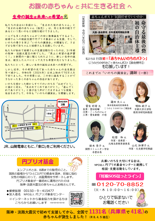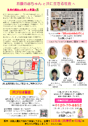 この講演会を通して、胎児も私達と同じ一つの命であり、その命はまわりの人達の愛によって心を芽生えさせ、人として成長していく事を学びたいと思います。